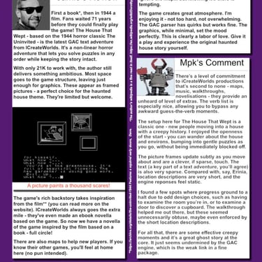THE HOUSE THAT WEEPS ( or The Haunting of Gale's Rest ) was another tricky adventure game to develop for the ZX Spectrum 48K.